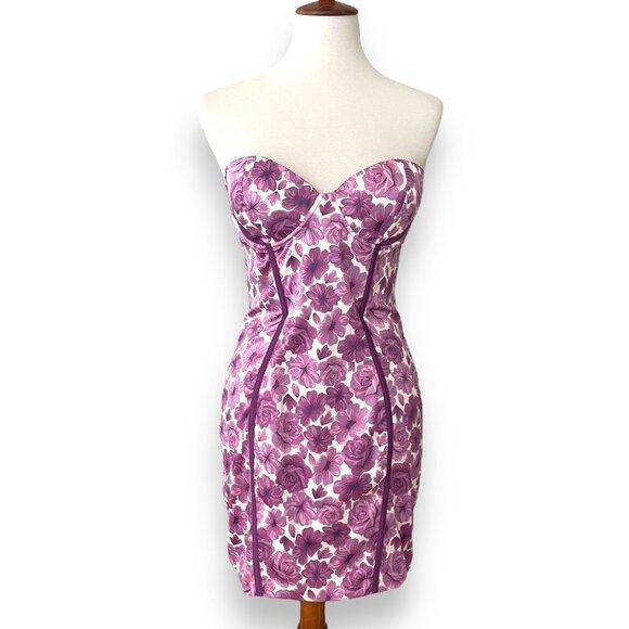 Oh Polly Purple Strapless Corset Floral Print Partywear Bodycon Dress Size 8 NWT