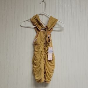 women's Oh Polly gold ruched bodycon mini dress sz 8. keyhole front back zip. 94% nylon, 6% elastane. New with tags. cut outs on sides of dress. elastic tie halter