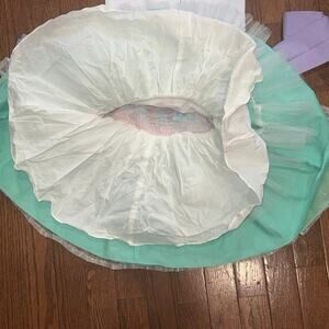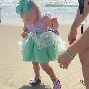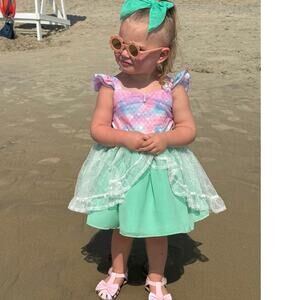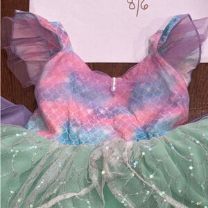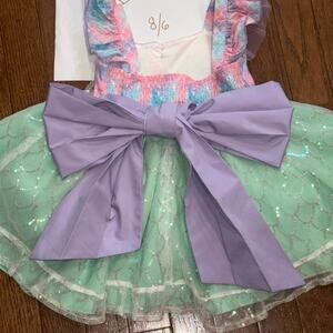 Oh Shana handmade mermaid princess dress, size 2T. Listing as GUC since I’m the 2nd owner. My daughter wore it once for about 20 minutes for photos, and I believe the previous owner’s child also only wore it briefly for pictures. Needs hand washing or dry cleaning—we did not wash after wearing due to minimal use. Features a sparkly mint, purple, and pink mermaid scale bodice with flutter sleeves, layered tulle skirt with shimmer detail, and a large attached lavender bow (no embroidery). Skirt has a built-in petticoat with tulle layers for extra puff and volume—perfect for twirling. Adorable and magical, ideal for photos, parties, or dress-up. Any little girl will feel like a true mermaid princess!