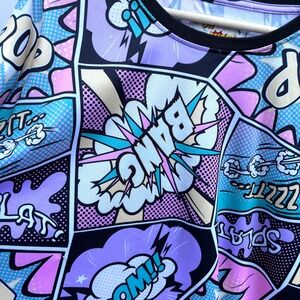 Eye-catching statement piece with a playful design. This short-sleeve T-shirt dress features a vibrant, all-over comic book print with "POP," "BANG," "SPLASH," and other action words against a background of purples, blues, and pinks. The top is designed in an oversized fit, perfect for a relaxed and comfortable style. A black ribbed crew neck adds a sporty contrast to the colorful print. Perfect for casual outings, comic conventions, or adding a pop of fun to your everyday wardrobe.