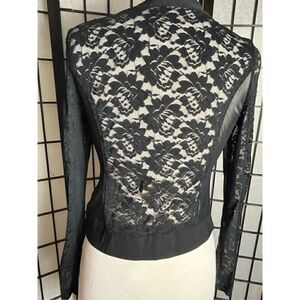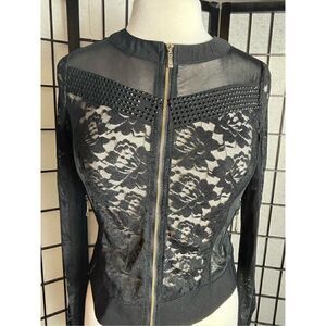 Black sheer top lace floral adorned sleeves zip up pockets jacket