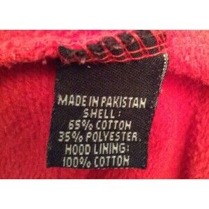 Overall good condition. There is one pinhole at top of the sweatshirt's hood. See photo.