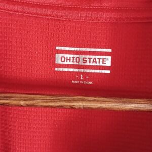 This is an officially licensed Ohio State Buckeyes men's quarter-zip pullover shirt in size large. It is gray and red in color, featuring a knit design. The shirt is designed for fans of the Ohio State Buckeyes football team and is ideal for representing the team in a stylish and comfortable way. It is an authentic product made in China.