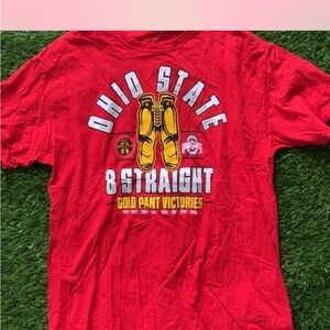 Red Ohio State graphic t-shirt featuring bold text and design. Perfect for fans.