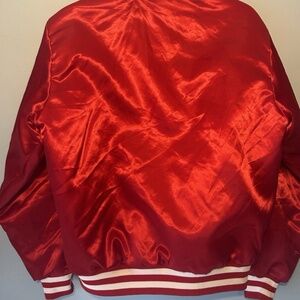 The Vintage Ohio State Buckeyes Swingster Snap Button Satin Jacket in size Medium is a classic piece of fan apparel for football enthusiasts. Made in the USA, this red jacket features the iconic Ohio State Buckeyes team logo, making it a must-have for any unisex adult fan. The Swingster brand ensures quality and style, while the snap button closure adds a touch of retro charm to your outfit. Perfect for showing your team pride in a unique and stylish