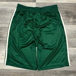 Green tan white colorway 3-stripes lightweight 100% polyester elastic waistband pull-on drawstring side vent embroidered logo activewear sportswear athletic athleisure sporty team Ohio Bobcats NCAA collegiate university basketball training shorts.