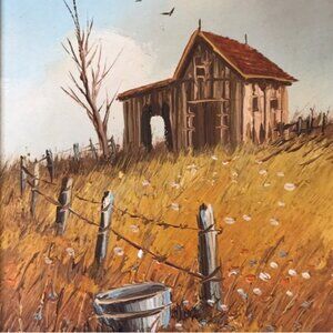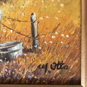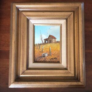 Extremely well executed from listed artist, M. Otto. Oil on board rustic country barn / stable landscape in beautiful wooden frame with linen mat, perfect for a gallery wall!
