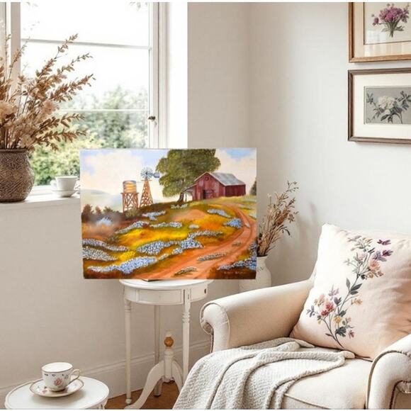 Oil Painting Canvas Barn Windmill Country 16x12 Hills Landscape by Lorine Bryan