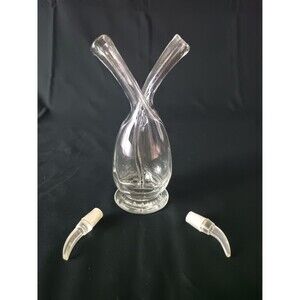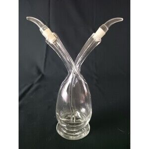 Oil and Vinegar Cruet Twin Decanter Clear Glass With Plugs. This interesting creation was literally melted together out of two identical halves. Hand made. Both plugs are present and provide a good seal. Can be used as a curious kitchen item or a shelf/table decoration.