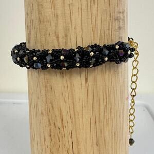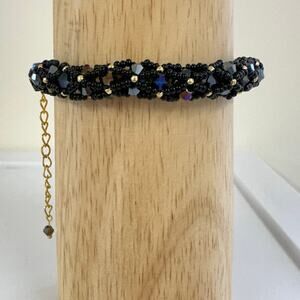 Beautifully handcrafted bracelet featuring glossy black seed beads, faceted iridescent crystals, and gold-tone accents woven into an elegant spiral design. Finished with a gold lobster clasp and 3” extender chain for a custom fit. Perfect for both casual chic and evening wear.