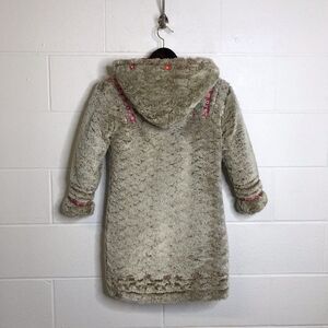 Oilily Girls Long Faux Fur Sherpa Like Coat Hooded Full Zip Embroidered Ribbons Size 140 10Y