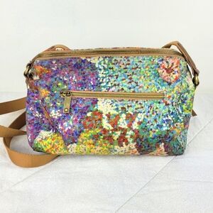 Oilily multi color artsy canvas bag tan adjustable canvas strap blue pocket OS