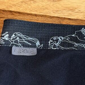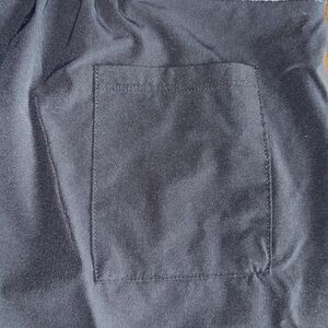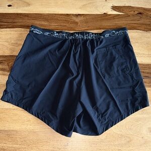 Oiselle black board shorts. Squiggle woman/dove print waistband. Elastic back with zipper snap closure. 3 pocket detail. Size 6. 16” waist across top laid flat. 10 7/8” rise. 5” inseam. Excellent pre owned condition
