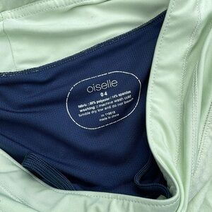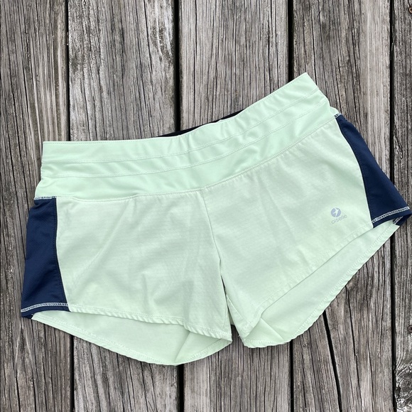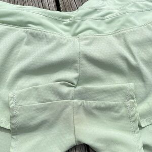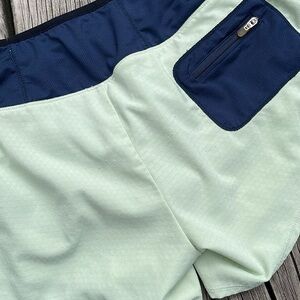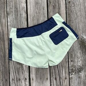 A classic style, updated with mesh panel sides and drop in pockets on the back waistband. Slight pilling on the back, faint staining in the crotch, no holes. Light green/navy.