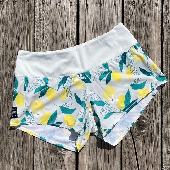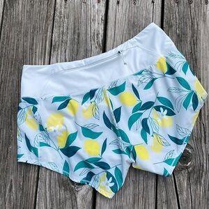 Classic style running shorts. Cute lemon print on a light blue background.