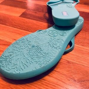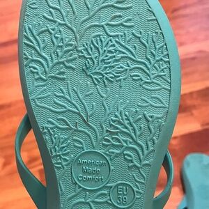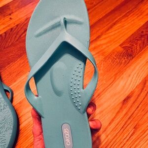 Like New Handmade Eco-friendly Waterproof sandals designed with reflexology principles in mind. These recycled AND recyclable shoes are made in Georgia from a soy bio-based materials and promote foot wellness in every way. Comfortable toe rests allow your toes to spread out and avoid cramping; strategically-placed massage beads encourage better circulation, and heel cups keep your foot from sliding out of place in the sandal. All of these features work in concert with arch supports to give you walking strength all day long