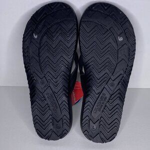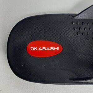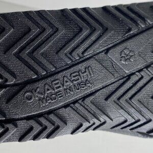 The Okabashi Women's Flip Flops in size Large are made in the USA and feature a slip-on closure for convenience. These casual sandals are designed with a rubber outsole and lining material, making them ideal for summer and spring seasons. The black color and solid pattern add a stylish touch, while the logo accents and USA theme make them a patriotic choice. The comfortable design of the sandals includes a flat heel style and rubber upper material, making them a practical and fashionable option for women's footwear.