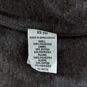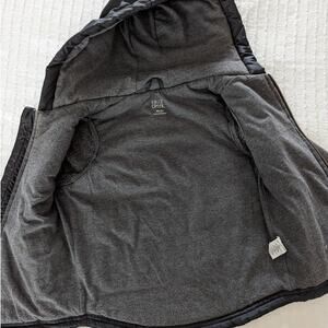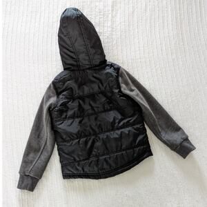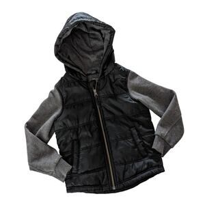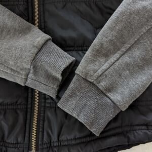 Great jacket for cooler spring/fall temps! Black puffer-like vest body with gray sweater sleeves and lined inside. Hooded, full zip, pockets.