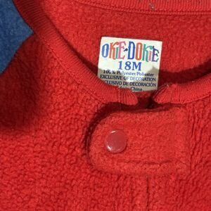 The Okie Dokie Fleece Red Sleeper is a warm and cozy zip-up pajama suit designed for boys in size 18 months.