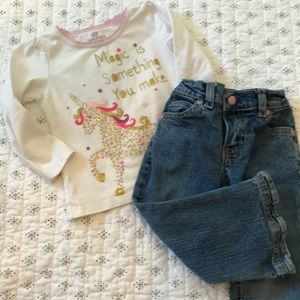 Super pretty unicorn print long sleeve top and Childrens Place bell bottom jeans. Hem is ruffled. Very adorable. Both are 18 month.