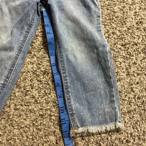 Closes with zipper and button. Frayed at bottom of legs.