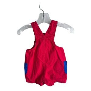 Vibrant red overalls featuring a playful bear and soccer patch. Great condition.