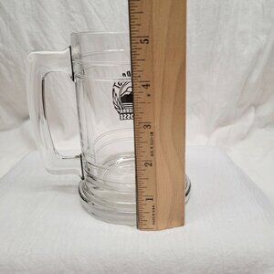 This glass beer mug is featuring the Oktoberfest High Sierra Lacrosse logo, it offers a sturdy handle for a comfortable grip. Its durable clear glass construction ensures longevity and style in beverage service, making it a reliable choice for events and gatherings.