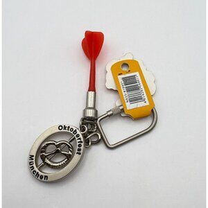 This keychain is a thoughtful and durable souvenir, featuring a Munich Oktoberfest pretzel charm and a vibrant red dart accent.