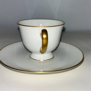 Okura Art White Porcelain Tea Cup and Saucer Set Japan 24K Gold Rims