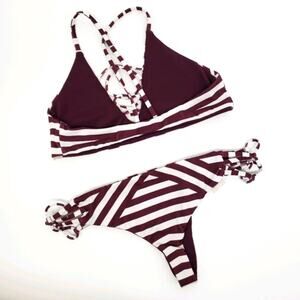Ola Feroz swimwear by Jessica Garcia! Sexy bikini for summer! Cuyagua bikini in Orinoco maroon striped bikini. This bikini does not have a size tag. Size listed is a guess based on measurements per the Oal Feroz website.