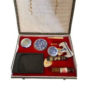 This vintage Chinese calligraphy set comes in its own fabric-covered box lined with red velvet. It contains everything needed to create the Chinese alphabet: four brushes, ink, mixing spoon and stone, porcelain brush holder, ink wells and hand carved soapstone chop (the individual signature used by artist or writer).