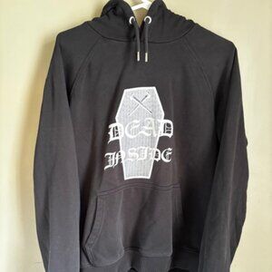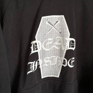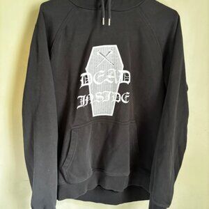 The front of the hoodie features a bold, graphic print of a coffin. Inside the coffin, in a distinctive Old English font, are the words "DEAD INSIDE." The top of the coffin features a subtle, crossed-out design, adding to the unique aesthetic.