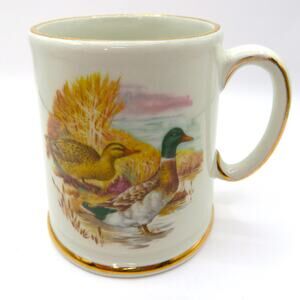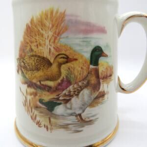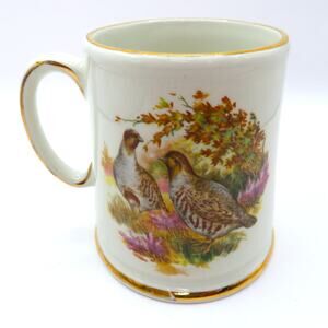 This vintage mug by James Kent Ltd (Old Foley) features two beautiful wildlife scenes: one of mallard ducks in a marsh, and one of partridge or quail in a woodland setting. Trimmed with gold on the rim, base, and handle, this Staffordshire-made piece is a lovely example of mid-20th-century English ceramic artistry. A great collectible or gift for lovers of game birds, hunting, or countryside décor.