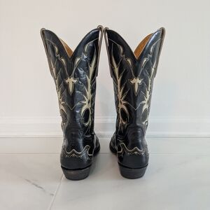 Stylish black leather boots with intricate cream embroidery. Perfect for a bold look.