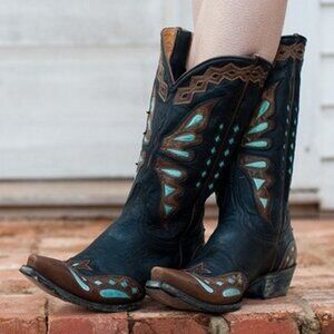 The perfect combination of 3 dimensional cut out designs and intricate overlay detailing make these cowgirl boots instantly come to life. The vibrant turquoise and deep chocolate brown coloring brings energy and excitement to the destructed black leather background.