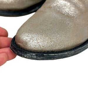 Item in Excellent Preowned Condition. Comes in original box, Metallic leather finish, Distressed finish with used style sole, Rear zipper closure, Asymmetric top line with star studs, Almond toe, 1” Heel. PLEASE SEE ALL PHOTOS.