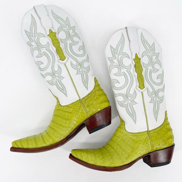 Striking Old Gringo western boots featuring genuine caiman leather vamp in chartreuse green paired with a white leather shaft detailed in intricate stitching. The pointed toe silhouette, pull straps, and stacked leather heel showcase classic Old Gringo artistry with bold vintage Y2K flair. A rare statement boot for collectors and fashion-forward cowgirls alike.