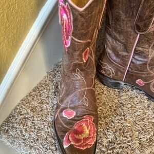 Beautiful and intricately embroidered Marsha boots from Old Gringo. Handmade of 100% Leather in brown and pink; pointy toe, Leather sole, Shaft measures approximately 10" from arch, Heel measures approximately 1 ¾", Boot opening measures approximately 12 ½" around.