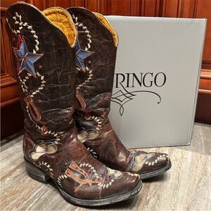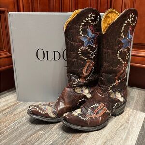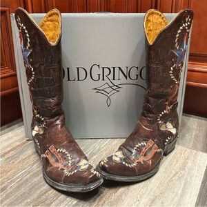 Preloved authentic Old Gringo Ye Haw Cowboy boots. Gorgeous patriotic Texas style cowgirl boots featuring exquisite embroidery and red Swarovski Crystal detail throughout. Design featuring spurs, cowboy hat, and stars makes these boots a cowgirl’s dream!! Preowned, but still in great condition with all crystal intact and sparkly! Size 7. Very rare collector boots!