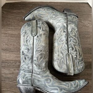 New distressed gray western boots with blue and yellow stitching