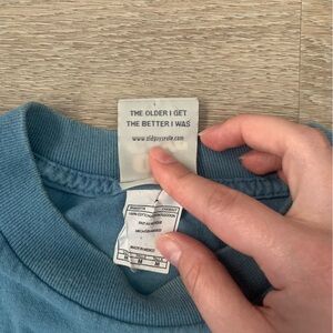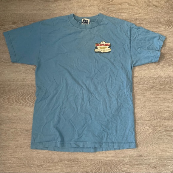 Old Guys Rule blue short-sleeve t-shirt. "Live Old Guys Rule Performing Nightly Bizarre Acts Bad Jokes Poor Taste" graphic on front and back. Has some small flaws on front, please see pictures. Size medium.