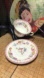 Excellent vintage condition with no cracks, chips or crazing. Gold trim has minimal wear. Approximate dimensions are 5 11/16”D x 2 5/8”H. Colorful and exotic floral pattern. Saucer has a blue, yellow and hot pink bird among the foliage. Elegant cup style has two interior floral decorations. Scrolling red border along the edge is a lovely element to the design.