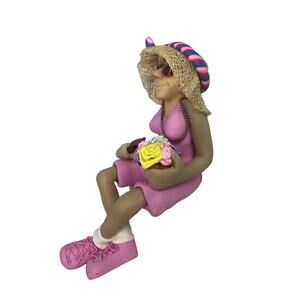Seated Elderly Women wearing apink dress, sunglasses, flowers and Hat!