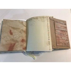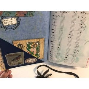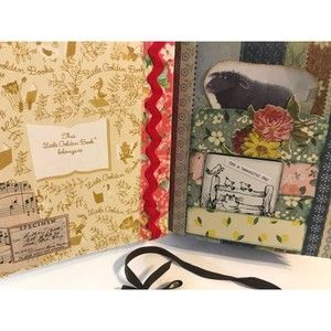 Fabric Covered Spine with buttons 2 Signatures- 18 pages each (62 front and back in each) Baby Animals on the Farm 1990 A Golden Book Pages mixed into the journal Variety of journal pages coffee dyed, designer pages, music sheets, children's book pages,etc Plenty of space for journaling plus journal cards, pockets, and tucks