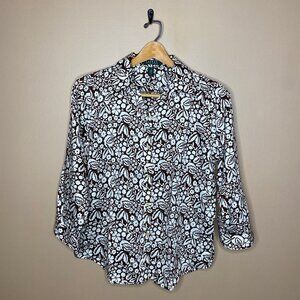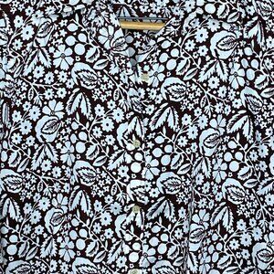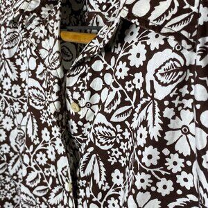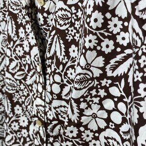 Old money, weekend vibes. The brown and white print is inspired by nature, adorned with leaves and blooming flowers. This shirt is a 3/4 length sleeve. This button down top is ideal for a cookout with friends, gardening, running errands, etc. Look effortlessly chic!