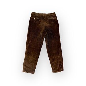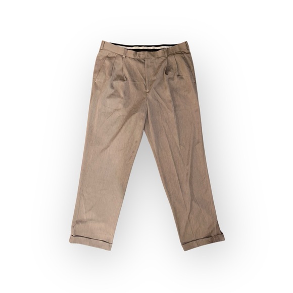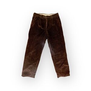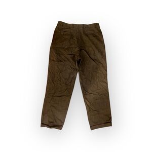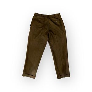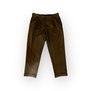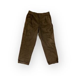 The collection includes a pair of classic corduroy pants in a rich dark brown, offering texture and warmth for a sophisticated fall or winter look. The other three trousers feature a pleated, high-rise design with a slightly relaxed fit, a hallmark of vintage tailoring. These include a subtle brown herringbone, a light tan linen-blend, and a solid darker brown.
