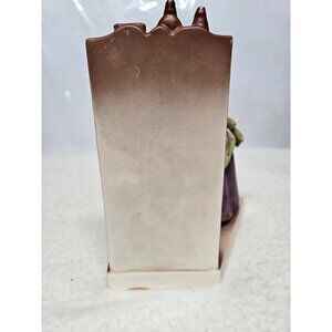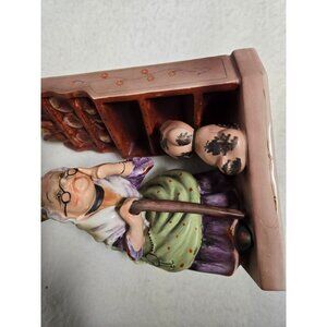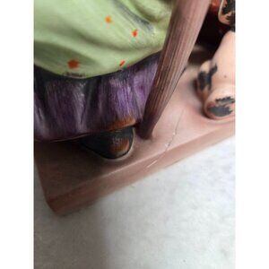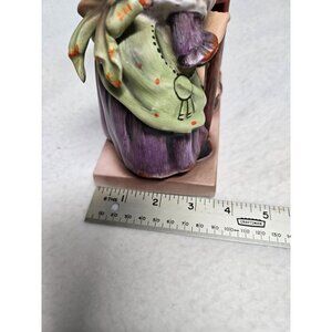 This finely crafted Old Mother Hubbard Figurine by Enesco is a vintage, hand-painted porcelain piece standing 7 inches high. Its colors are a charming mix of green and purple, adding a touch of whimsy to your collection.