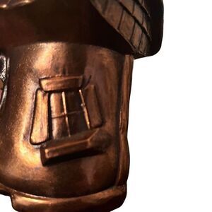 Heavy cast metal bank. Bronze copper colored, shoe house design with shingled roof, chimney, windows, door, porch light and shoelaces.