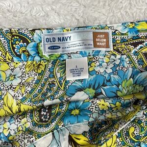 Skirt by Old Navy featuring a blue, yellow, white, and green paisley pattern in 100% silk. No stretch, and not lined. Double button and zip closure on side.