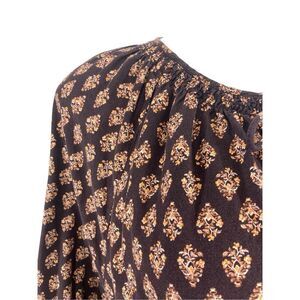 Gorgeous lightweight midi length dress featuring balloon sleeves, tie neck, a tiable cinched waist and tiered skirt. All in a fall toned black and brown scarf print. Very Little House on the Prairie!